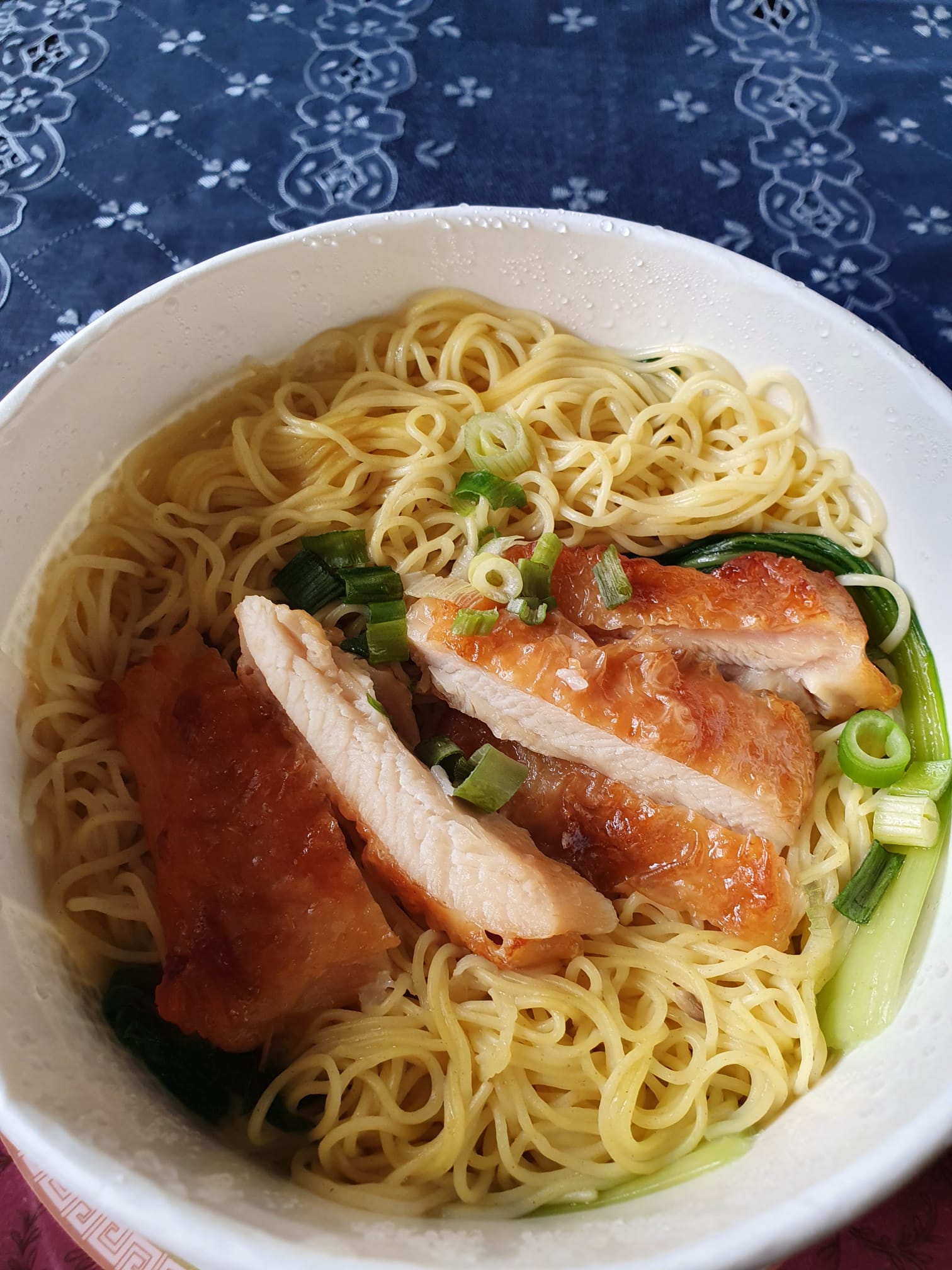 Hainanese chicken rice : is a dish of poached chicken and seasoned rice, served with chilli sauce and usually with cucumber garnishes.